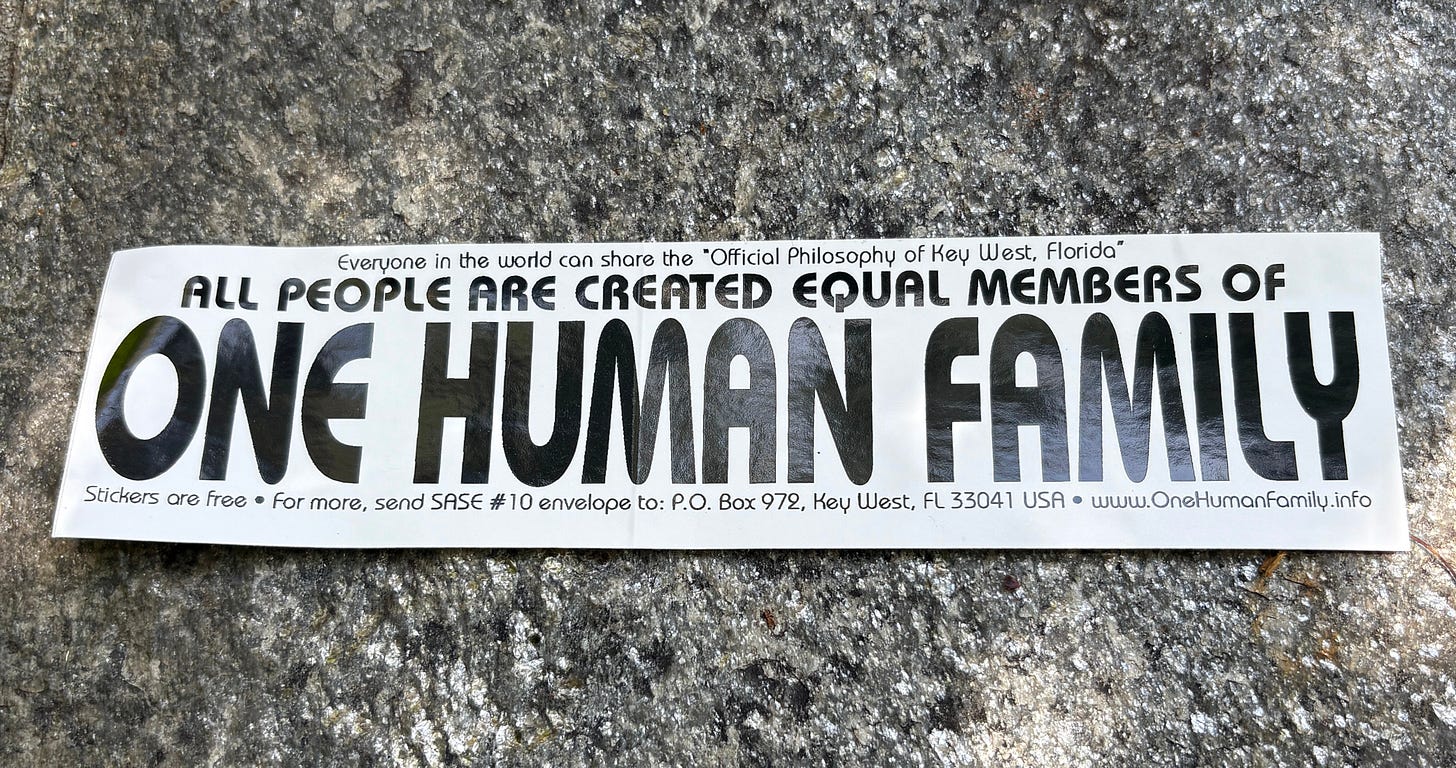 Back in 2010, when I returned to Key West after a ten-year hiatus, I saw a simple black and white sticker tacked on surfaces all over town that read: All People are created equal members of One Human Family. Above it, in small type were the words: Everyone in the world can share the “Official Philosophy of Key West, Florida.”